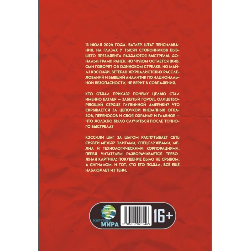 13 июля 2024 года. Батлер, штат Пенсильвания. На глазах у тысяч сторонников бывшего президента раздаются выстрелы. Дональд Трамп ранен, но чудом остаётся жив. СМИ говорят об одиноком стрелке. Но Майлз Кэссиди, ветеран журналистских расследований и бывший аналитик по национальной безопасности, не верит в совпадения. Кто отдал приказ? Почему целью стал именно Батлер забытый город, олицетворяющий сердце глубинной Америки? Что скрывается за цепочкой внезапных отказов, переносов и сбоя охраны? И главное что должно было случиться после точного выстрела?Кэссиди шаг за шагом распутывает сеть связей между элитами, спецслужбами, медиа и технологическими корпорациями. Перед читателем разворачивается тревожная картина: покушение было не срывом, а сигналом. И тот, кто его подал, всё ещё наблюдает из тени.