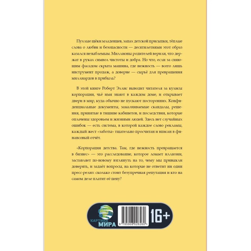 Пухлые щёки младенцев, запах детской присыпки, тёплые слова о любви и безопасности десятилетиями этот образ казался незыблемым. Миллионы родителей верили, что держат в руках символ чистоты и добра. Но что, если за сияющим фасадом скрыта машина, где нежность всего лишь инструмент продаж, а доверие сырьё для превращения миллиардов в прибыль?В этой книге Роберт Эллис выводит читателя за кулисы корпорации, чьё имя знают в каждом доме, и открывает двери в мир, куда обычно не пускают посторонних. Конфиденциальные документы, замалчиваемые скандалы, решения, принятые в тишине кабинетов, и последствия, которые оплачены здоровьем и жизнями людей. Здесь нет случайных ошибок есть система, в которой каждое слово рекламы, каждый жест заботы тщательно просчитан и вписан в финансовый отчёт.