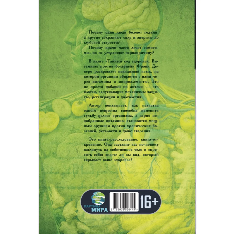 Почему одни люди болеют годами, а другие сохраняют силу и энергию до глубокой старости?Почему врачи часто лечат симптомы, но не устраняют первопричину?В книге Тайный код здоровья. Витамины против болезней Фрэнк Деверо раскрывает невидимый язык, на котором организм общается с нами через витамины и микроэлементы. Это не просто добавки из аптеки это ключи, запускающие механизмы защиты, регенерации и долголетия. Автор показывает, как нехватка одного вещества способна изменить судьбу целого организма, а верно подобранные витамины становятся мощным оружием против хронических болезней, усталости и даже старения. Это книга-расследование, книга-откровение. Она заставит вас по-новому взглянуть на собственное тело и спросить себя: знаете ли вы код, который скрывает ваше здоровье?