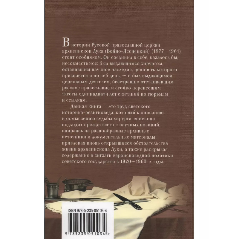 Архиепископ Лука (Войно-Ясенецкий). Одинцов М. И. В истории Русской православной церкви архиепископ Лука (Войно-Ясенецкий) (18771961) стоит особняком. Он соединил в себе, казалось бы, несовместимое: был выдающимся хирургом, спасавшим людей в трех войнах Русско-японской, Гражданской и Великой Отечественной, оставившим научное наследие, ценность которого признается и по сей день, и был выдающимся церковным деятелем, бесстрашно отстаивавшим русское православие и стойко перенесшим тяготы одиннадцати лет скитаний по тюрьмам и ссылкам. И ныне, спустя шесть десятилетий после кончины, память о нем живет и в научной, и в церковной среде. Открыты музеи и постоянно действующие выставки, установлены памятники и мемориальные доски, учреждены премии и стипендии, сняты фильмы и изданы книги, посвященные врачу В. Ф. Войно-Ясенецкому. И вместе с тем святитель Лука был причислен сначала к лику местночтимых святых, а затем, в 2000 году, и к лику святых для общецерковного почитания. Возводятся храмы в его имя, пишутся иконы и молитвы, совершаются богослужения. Данная книга это труд светского историка-религиоведа, который подходит к описанию и осмыслению судьбы хирурга-епископа прежде всего с научных позиций, опираясь на разнообразные архивные источники и документальные материалы, привлекая вновь открывшиеся обстоятельства жизни архиепископа Луки, а также раскрывая содержание и зигзаги вероисповедной политики советского государства в 19201960-е годы.
