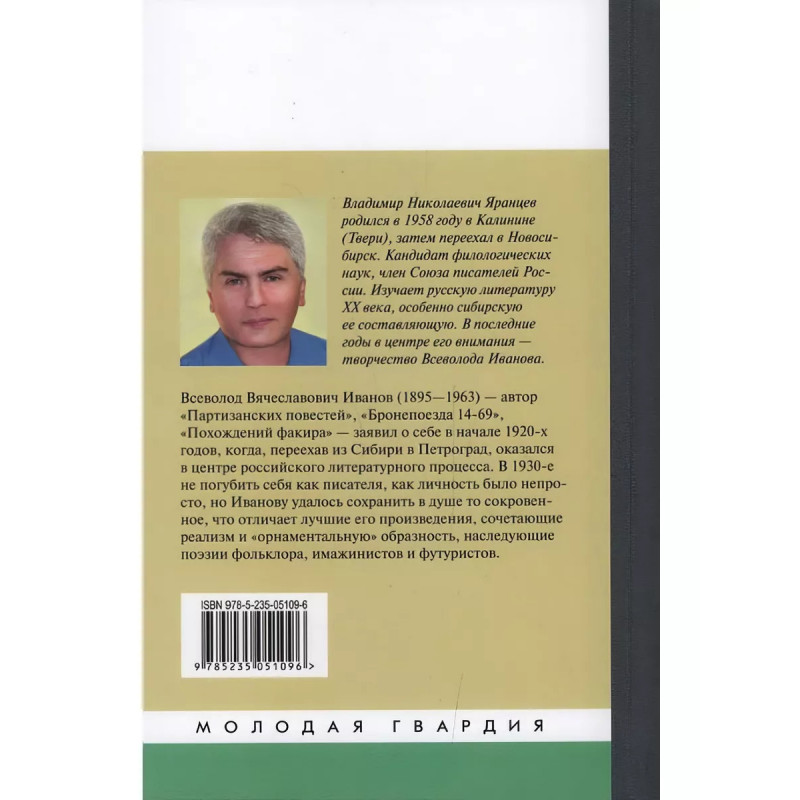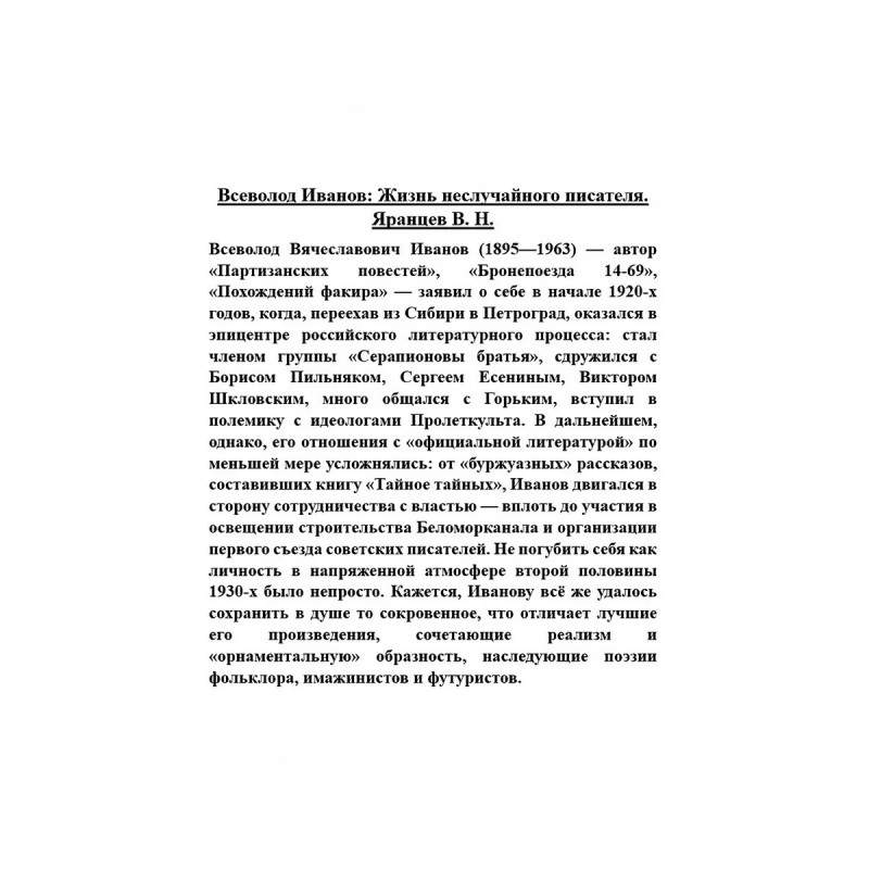 Всеволод Иванов: Жизнь неслучайного писателя. Яранцев В. Н. Всеволод Вячеславович Иванов (18951963) автор Партизанских повестей, Бронепоезда 14-69, Похождений факира заявил о себе в начале 1920-х годов, когда, переехав из Сибири в Петроград, оказался в эпицентре российского литературного процесса: стал членом группы Серапионовы братья, сдружился с Борисом Пильняком, Сергеем Есениным, Виктором Шкловским, много общался с Горьким, вступил в полемику с идеологами Пролеткульта. В дальнейшем, однако, его отношения с официальной литературой по меньшей мере усложнялись: от буржуазных рассказов, составивших книгу Тайное тайных, Иванов двигался в сторону сотрудничества с властью вплоть до участия в освещении строительства Беломорканала и организации первого съезда советских писателей. Не погубить себя как личность в напряженной атмосфере второй половины 1930-х было непросто. Кажется, Иванову всё же удалось сохранить в душе то сокровенное, что отличает лучшие его произведения, сочетающие реализм и орнаментальную образность, наследующие поэзии фольклора, имажинистов и футуристов.