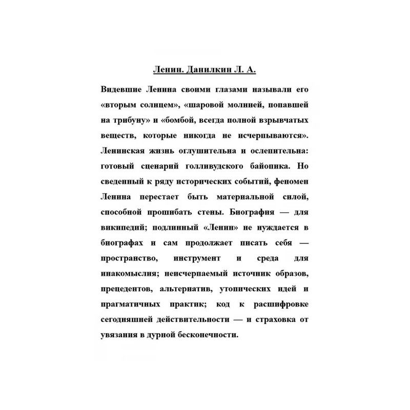 Ленин. Данилкин Л. А. Видевшие Ленина своими глазами называли его вторым солнцем, шаровой молнией, попавшей на трибуну и бомбой, всегда полной взрывчатых веществ, которые никогда не исчерпываются. Ленинская жизнь оглушительна и ослепительна: готовый сценарий голливудского байопика. Но сведенный к ряду исторических событий, феномен Ленина перестает быть материальной силой, способной прошибать стены. Биография для википедий; подлинный Ленин не нуждается в биографах и сам продолжает писать себя пространство, инструмент и среда для инакомыслия; неисчерпаемый источник образов, прецедентов, альтернатив, утопических идей и прагматичных практик; код к расшифровке сегодняшней действительности и страховка от увязания в дурной бесконечности.
