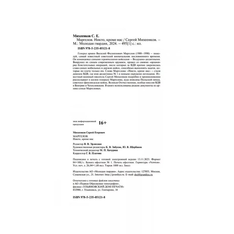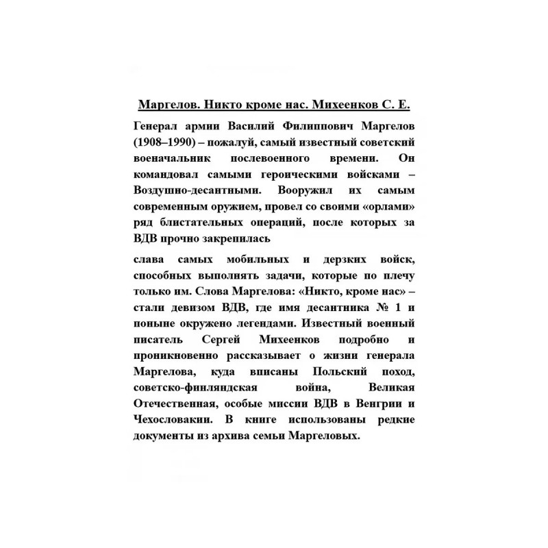 Маргелов. Никто кроме нас. Михеенков С. Е. Генерал армии Василий Филиппович Маргелов (19081990) пожалуй, самый известный советский военачальник послевоенного времени. Он командовал самыми героическими войсками Воздушно-десантными. Вооружил их самым современным оружием, провел со своими орлами ряд блистательных операций, после которых за ВДВ прочно закрепиласьслава самых мобильных и дерзких войск, способных выполнять задачи, которые по плечу только им. Слова Маргелова: Никто, кроме нас стали девизом ВДВ, где имя десантника № 1 и поныне окружено легендами. Известный военный писатель Сергей Михеенков подробно и проникновенно рассказывает о жизни генерала Маргелова, куда вписаны Польский поход, советско-финляндская война, Великая Отечественная, особые миссии ВДВ в Венгрии и Чехословакии. В книге использованы редкие документы из архива семьи Маргеловых.