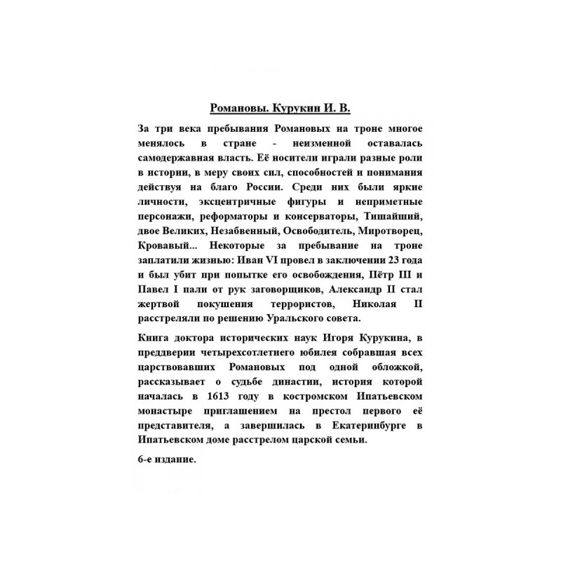 Романовы. Курукин И. В. За три века пребывания Романовых на троне многое менялось в стране - неизменной оставалась самодержавная власть. Её носители играли разные роли в истории, в меру своих сил, способностей и понимания действуя на благо России. Среди них были яркие личности, эксцентричные фигуры и неприметные персонажи, реформаторы и консерваторы, Тишайший, двое Великих, Незабвенный, Освободитель, Миротворец, Кровавый... Некоторые за пребывание на троне заплатили жизнью: Иван VI провел в заключении 23 года и был убит при попытке его освобождения, Пётр III и Павел I пали от рук заговорщиков, Александр II стал жертвой покушения террористов, Николая II расстреляли по решению Уральского совета. Книга доктора исторических наук Игоря Курукина, в преддверии четырехсотлетнего юбилея собравшая всех царствовавших Романовых под одной обложкой, рассказывает о судьбе династии, история которой началась в 1613 году в костромском Ипатьевском монастыре приглашением на престол первого её представителя, а завершилась в Екатеринбурге в Ипатьевском доме расстрелом царской семьи.6-е издание.