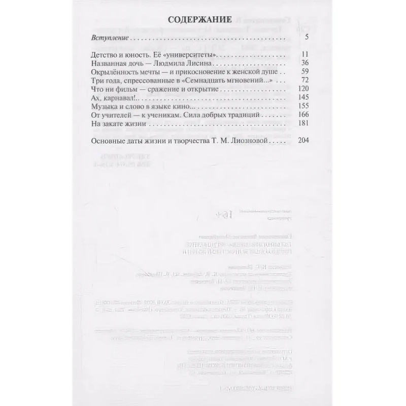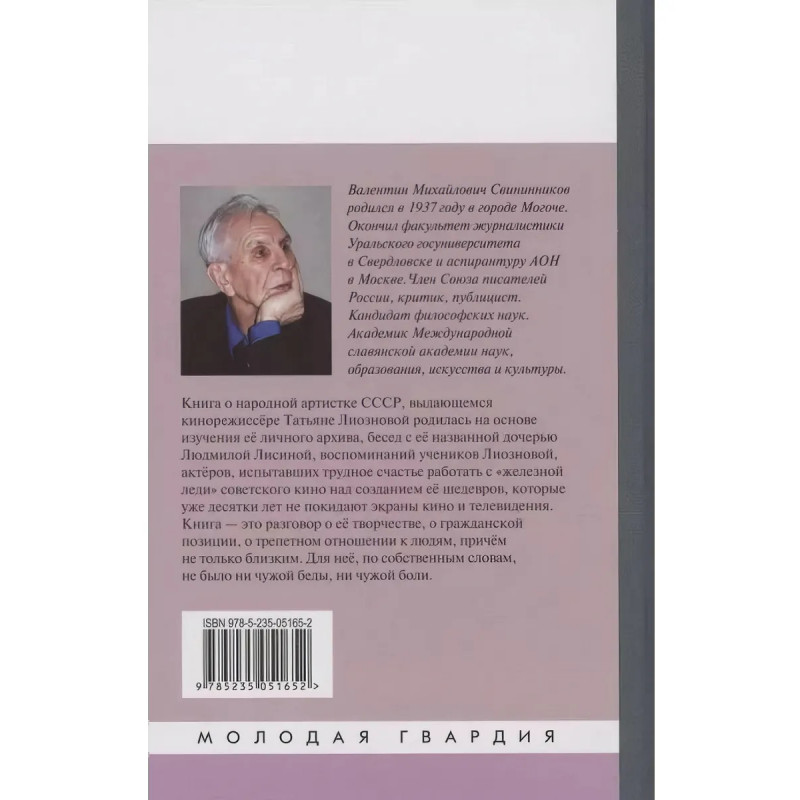 Татьяна Лиознова: Мгновения прекрасной и яростной жизни. Свининников В. М. Книга о народной артистке СССР, выдающемся кинорежиссёре Татьяне Лиозновой родилась на основе тщательного изучения её личного архива, проведённого автором книги впервые, бесед с её названной дочерью Людмилой Лисиной, воспоминаний учеников Лиозновой, актёров, испытавших трудное счастье работать с железной леди советского кино над созданием её шедевров, которые уже десятки лет не покидают экраны кино и телевидения. Книга это разговор о её творчестве, о гражданской позиции, о трепетном отношении к людям, причём не только близким. Для неё, по собственным словам, не было ни чужой беды, ни чужой боли.