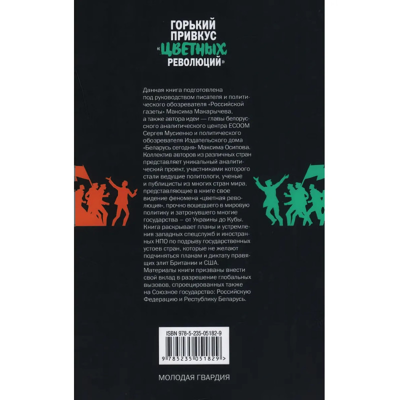 Горький привкус "цветных революций": Сборник Макарычев М. А., Осипов М. В. 2024. В сборнике, подготовленном под руководством писателя, политического обозревателя Российской газеты Максима Макарычева, автора идеи главы белорусского аналитического центра EсооM Сергея Мусиенко и политического обозревателя Издательского дома Беларусь сегодня Максима Осипова, коллектив авторов из различных стран представляет уникальный аналитический проект, участниками которого стали ведущие политологи, ученые и публицисты из многих стран мира. Авторы проекта представляют в книге свое видение феномена цветная революция, прочно вошедшего в мировую политику и затронувшего многие государства от Украины до Кубы. Книга раскрывает планы и устремления западных спецслужб и иностранных НПО по подрыву государственных устоев стран, которые не желают подчиняться планам и диктату правящих элит Британии и США. Материалы книги призваны внести свой вклад в разрешение глобальных вызовов, спроецированных также на Союзное государство: Российскую Федерацию и Республику Беларусь.