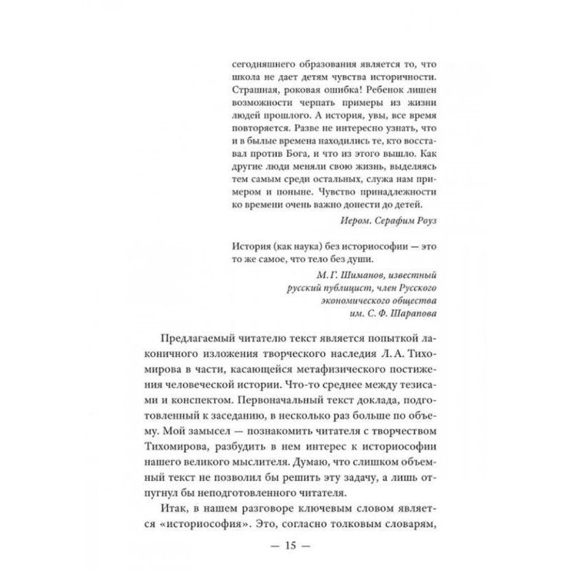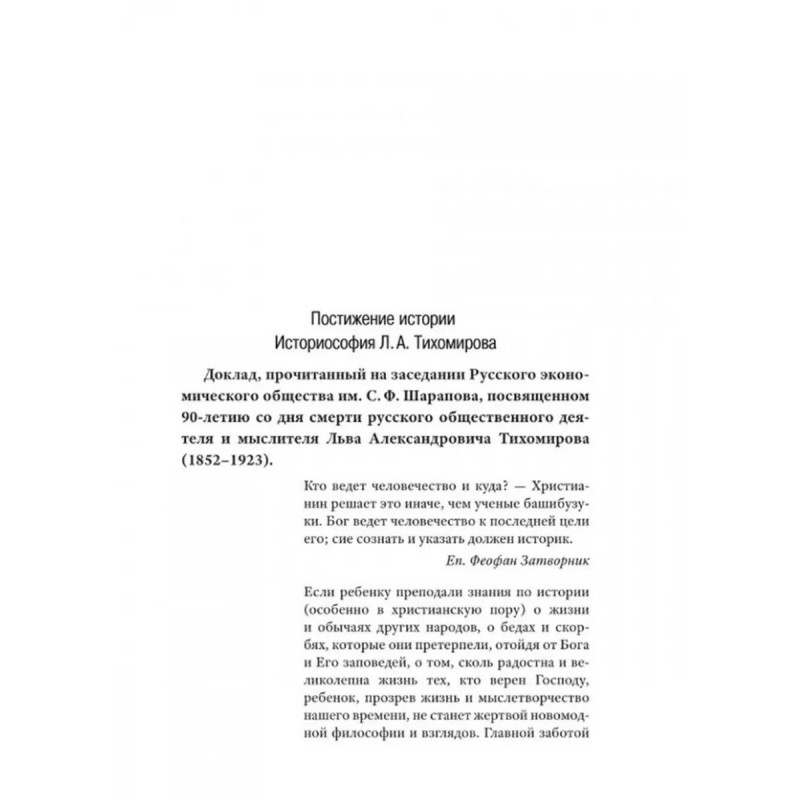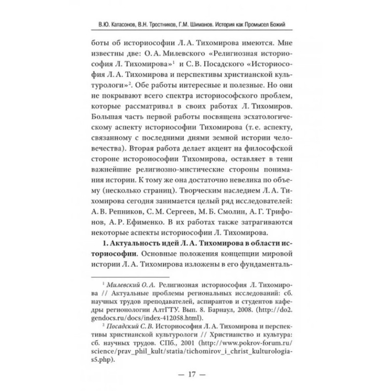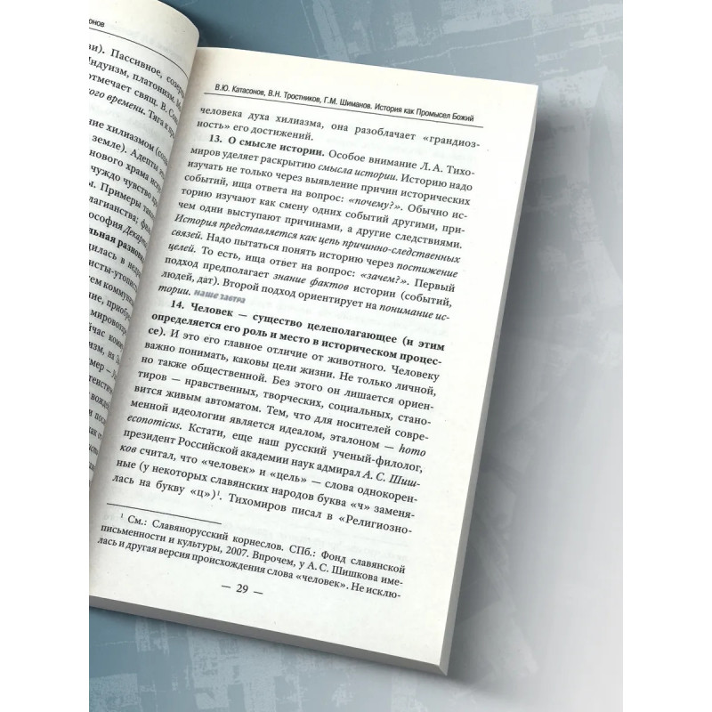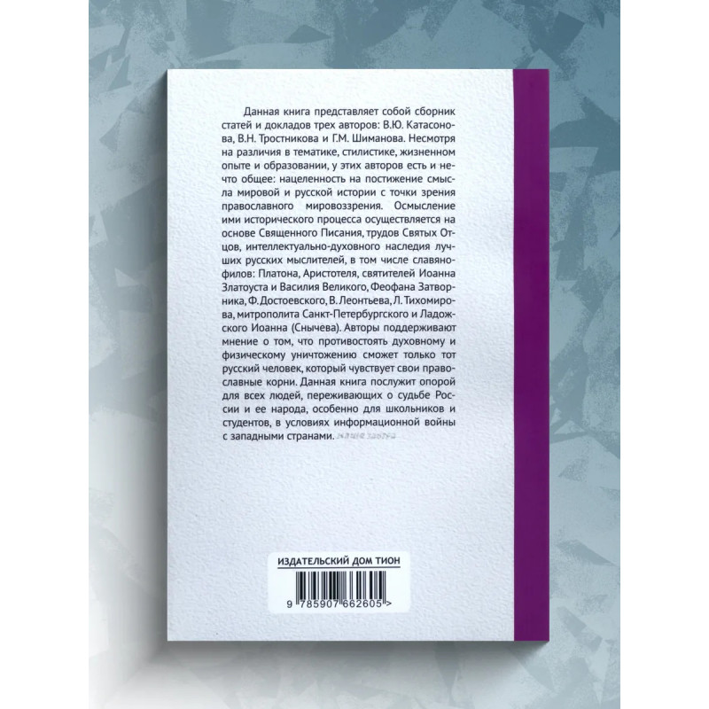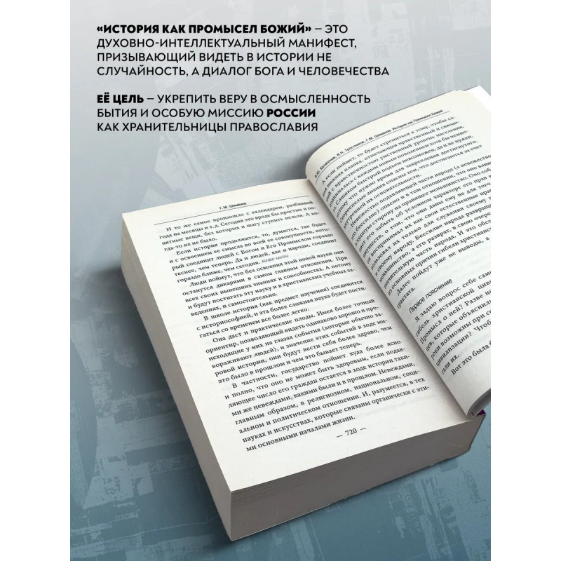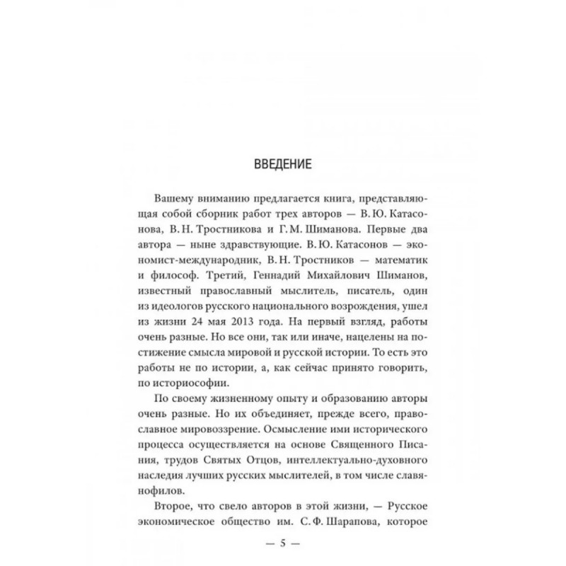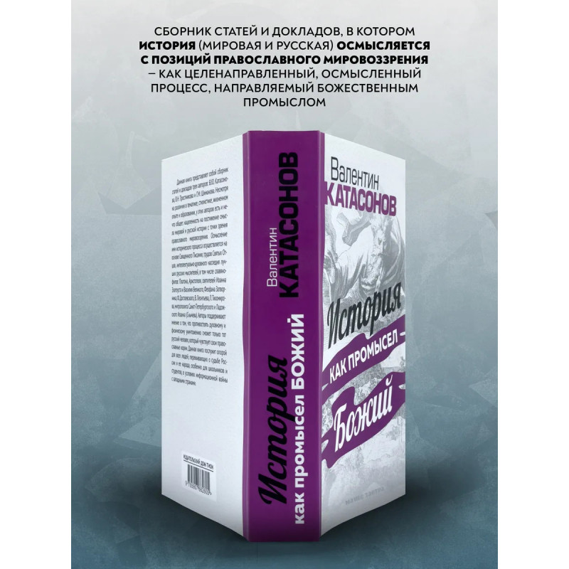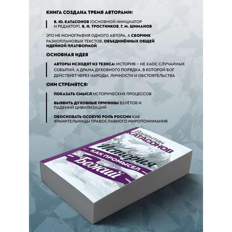 История как Промысел Божий. Катасонов В.Ю. Данная книга представляет собой сборник статей и докладов трех авторов: В. Ю. Катасонова, В. Н. Тростникова и Г. М. Шиманова. Несмотря на различия в тематике, стилистике, жизненном опыте и образовании, у этих авторов есть и нечто общее: нацеленность на постижение смысла мировой и русской истории с точки зрения православного мировоззрения. Осмысление ими исторического процесса осуществляется на основе Священного Писания, трудов Святых Отцов, интеллектуально-духовного наследия лучших русских мыслителей, в том числе славянофилов:Платона, Аристотеля, святителей Иоанна Златоуста и Василия Великого, Феофана Затворника, Ф. Достоевского, В. Леонтьева, Л. Тихомирова, митрополита Санкт-Петербургского и Ладожского Иоанна (Снычева). Авторы поддерживают мнение о том, что противостоять духовному и физическому уничтожению сможет только тот русский человек, который чувствует свои православные корни. Данная книга послужит опорой для всех людей, переживающих о судьбе России и ее народа, особенно для школьников и студентов, в условиях информационной войны с западными странами.