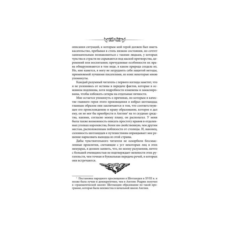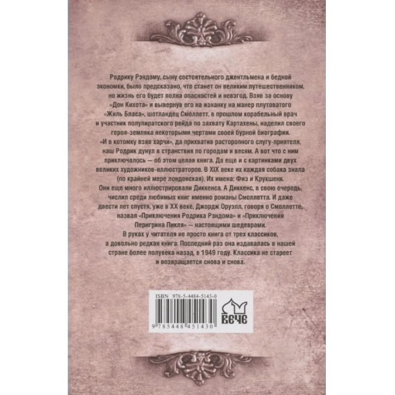 Родрику Рэндому, сыну состоятельного джентльмена и бедной экономки, было предсказано, что станет он великим путешественником, но жизнь его будет полна опасностей и невзгод. Взяв за основу "Дон Кихота" и вывернув его на изнанку на манер плутоватого "Жиль Бласа", шотландец Смоллетт, в прошлом корабельный врач и участник полупиратского рейда по захвату Картахены, наделил своего героя-земляка некоторыми чертами своей бурной биографии. "И в котомку взяв харчи", да прихватив расторопного слугу-приятеля, наш Родрик дунул в странствия по городам и весям. А вот что с ним приключалось об этом целая книга. Да еще и с картинками двух великих художников-иллюстраторов. В XIX веке их каждая собака знала (по крайней мере лондонская). Их имена: Физ и Крукшенк. Они еще много иллюстрировали Диккенса. А Диккенс, в свою очередь, числил среди любимых книг именно романы Смоллетта. И даже двести лет спустя, уже в XX веке, Джордж Оруэлл, говоря о Смоллетте, назвал "Приключения Родрика Рэндома" и "Приключения Перегрина Пикля" настоящими шедеврами. В руках у читателя не просто книга от трех классиков, а довольно редкая книга. Последний раз она издавалась в нашей стране более полувека назад, в 1949 году. Классика не стареет и возвращается снова и снова.