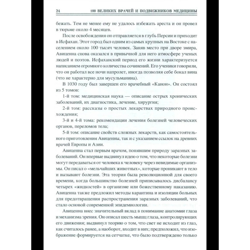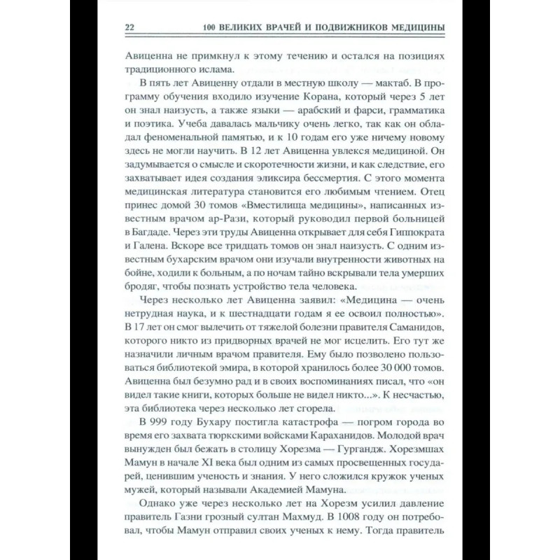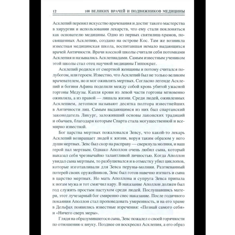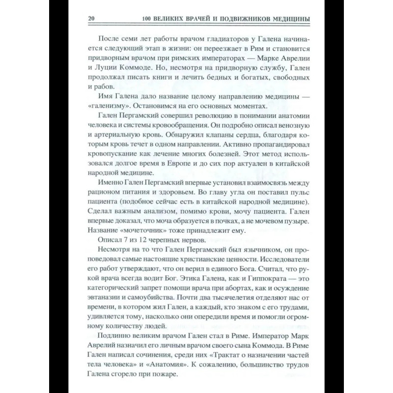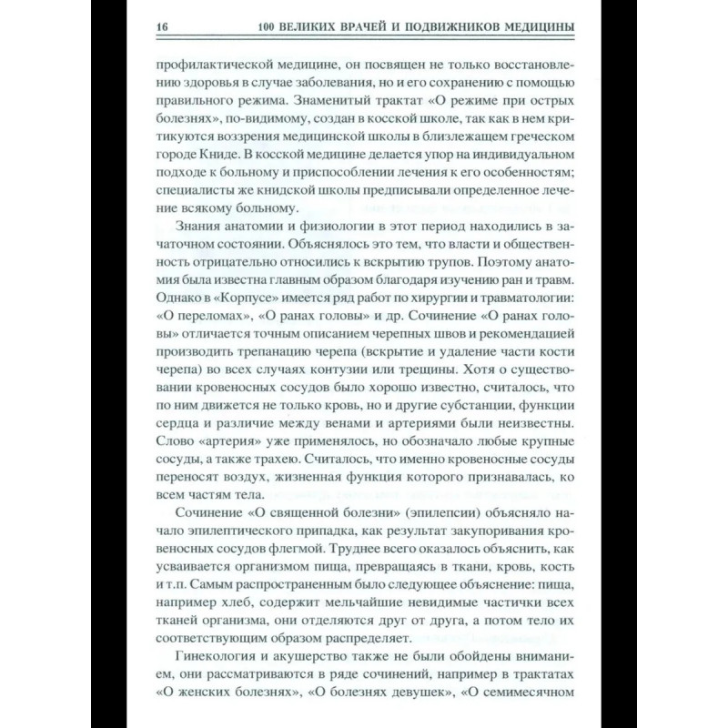 История медицины знает немало великих имен. Некоторые врачи и исследователи сделали настолько важные открытия в медицине, что их имена вошли в историю наряду с Гиппократом. Они спасали жизни и показали миру, что медицина— это не просто наука, но и искусство. В книге представлены жизнеописания выдающихся врачей и подвижников медицины прошлого и настоящего, прославившихся в различных областях медицинской науки: в хирургии, изучении человеческого организма и влияний на него окружающей среды, виразработке симптоматики болезней, проблем диагностики и профилактики, в создании сложнейших методик лечения и ныне известных каждому человеку медицинских приборов ит.д. Читатель познакомится с поистине героической, подвижнической жизнью 100 великих деятелей мировой медицины. Среди них— Асклепий и Авиценна, Парацельс и Гарвей, Ларрей и Пирогов, Пастер и Сеченов, Мечников и Павлов, Бехтерев и Илизаров...