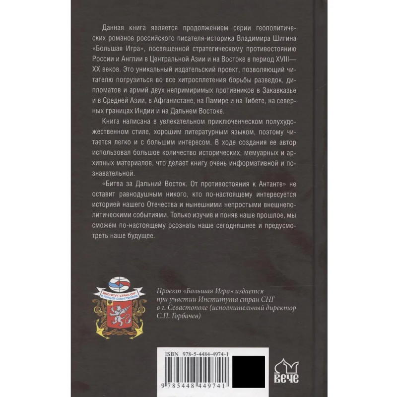 Данная книга является продолжением серии геополитических романов российского писателя-историка Владимира Шигина «Большая Игра», посвященной стратегическому противостоянию России и Англии в Центральной Азии и на Востоке в период XVIII-XX веков. Это уникальный издательский проект, позволяющий читателю погрузиться во все хитросплетения борьбы разведок, дипломатов и армий двух непримиримых противников в Закавказье и в Средней Азии, в Афганистане, на Памире и на Тибете, на северных границах Индии и на Дальнем Востоке.Книга написана в увлекательном приключенческом полухудожественном стиле, хорошим литературным языком, поэтому читается легко и с большим интересом. В ходе создания ее автор использовал большое количество исторических, мемуарных и архивных материалов, что делает книгу очень информативной и познавательной.«Битва за Дальний Восток. От противостояния к Антанте» не оставит равнодушным никого, кто по-настоящему интересуется историей нашего Отечества и нынешними непростыми внешнеполитическими событиями. Толь