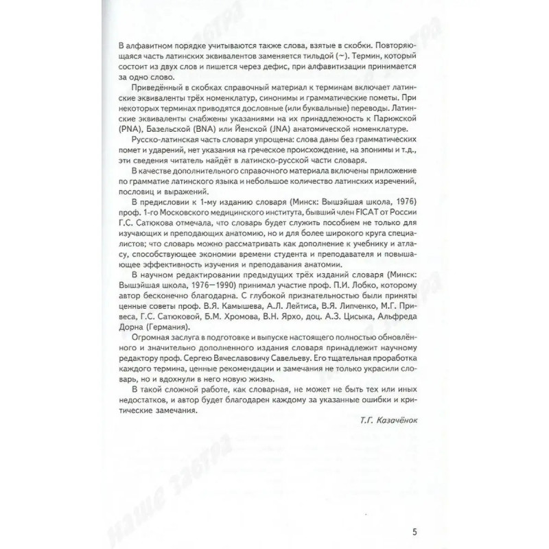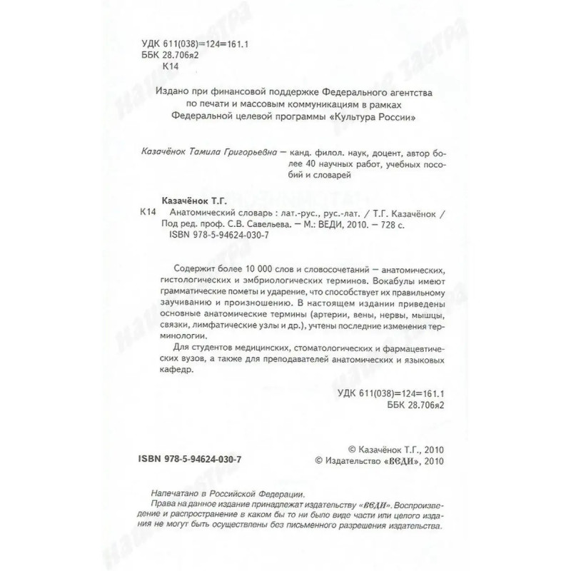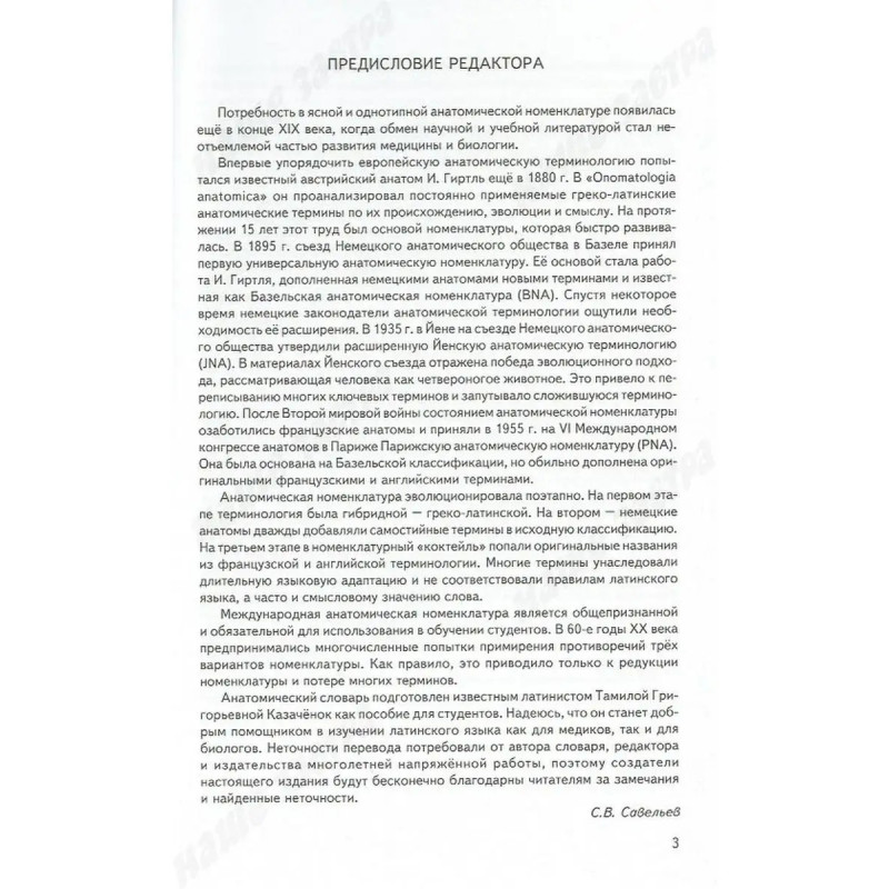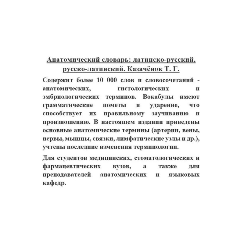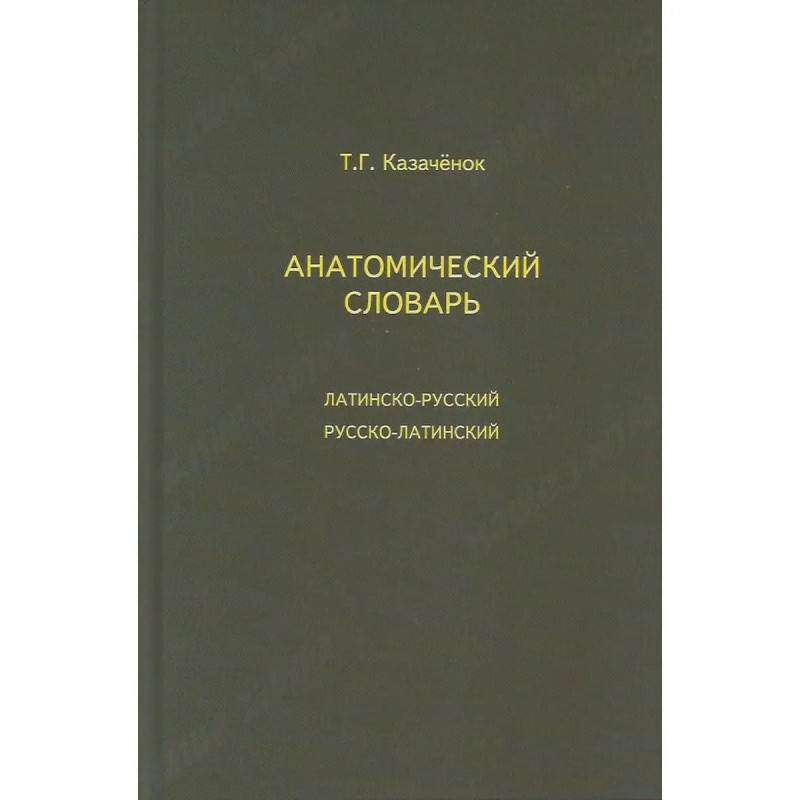 ISBN 978-5-94624-030-7. Анатомический словарь: латинско-русский, русско-латинский. Казачёнок Т.Г. Содержит более 10 000 слов и словосочетаний - анатомических, гистологических и эмбриологических терминов. Вокабулы имеют грамматические пометы и ударение, что способствует их правильному заучиванию и произношению. В настоящем издании приведены основные анатомические термины (артерии, вены, нервы, мышцы, связки, лимфатические узлы и др.), учтены последние изменения терминологии. Для студентов медицинских, стоматологических и фармацевтических вузов, а также для преподавателей анатомических и языковых кафедр.
