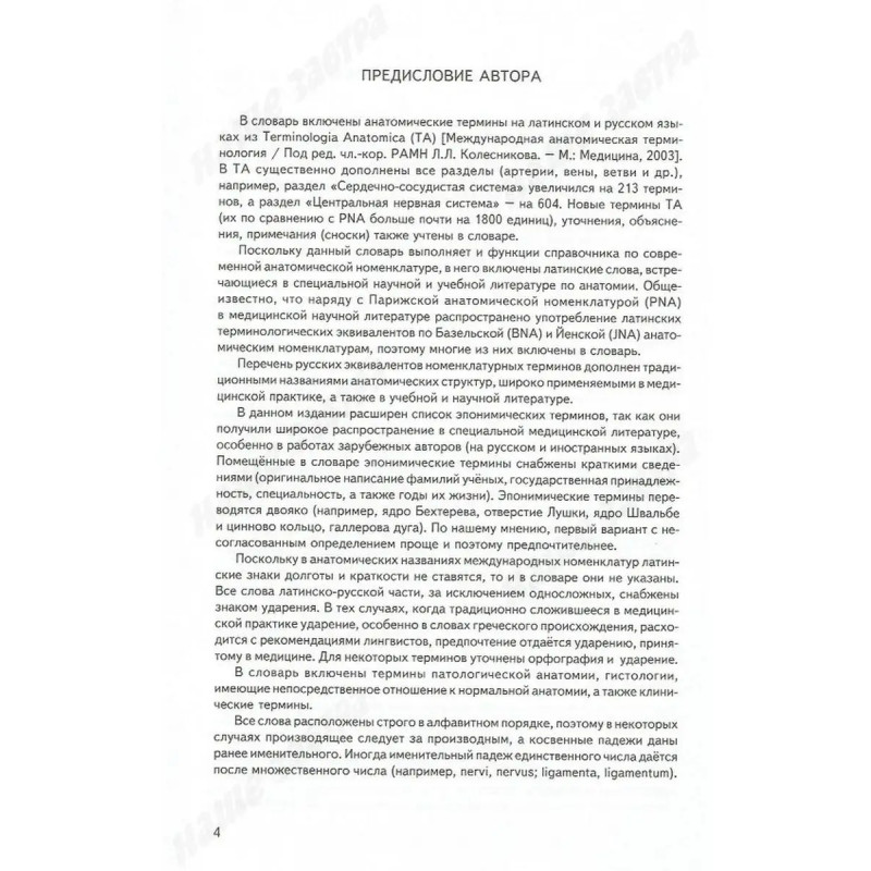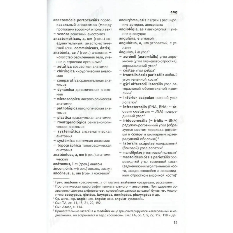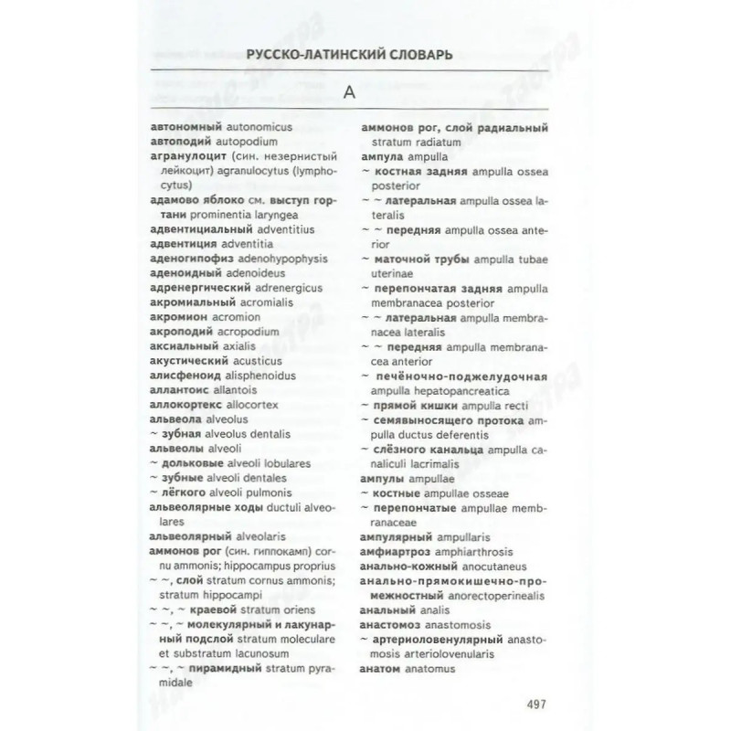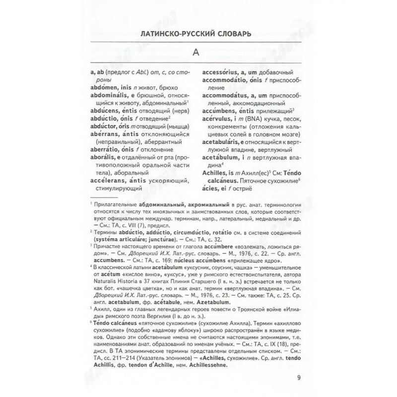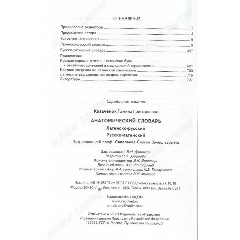 ISBN 978-5-94624-030-7. Анатомический словарь: латинско-русский, русско-латинский. Казачёнок Т.Г. Содержит более 10 000 слов и словосочетаний - анатомических, гистологических и эмбриологических терминов. Вокабулы имеют грамматические пометы и ударение, что способствует их правильному заучиванию и произношению. В настоящем издании приведены основные анатомические термины (артерии, вены, нервы, мышцы, связки, лимфатические узлы и др.), учтены последние изменения терминологии. Для студентов медицинских, стоматологических и фармацевтических вузов, а также для преподавателей анатомических и языковых кафедр.