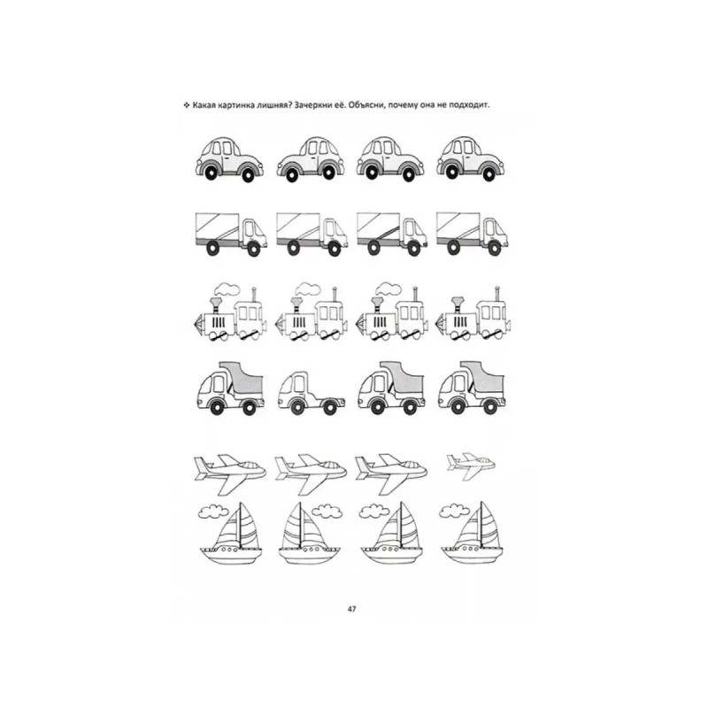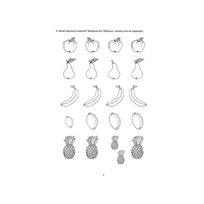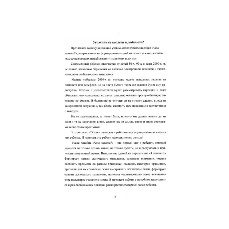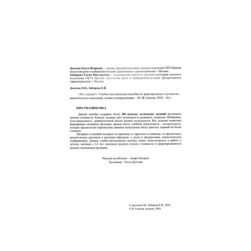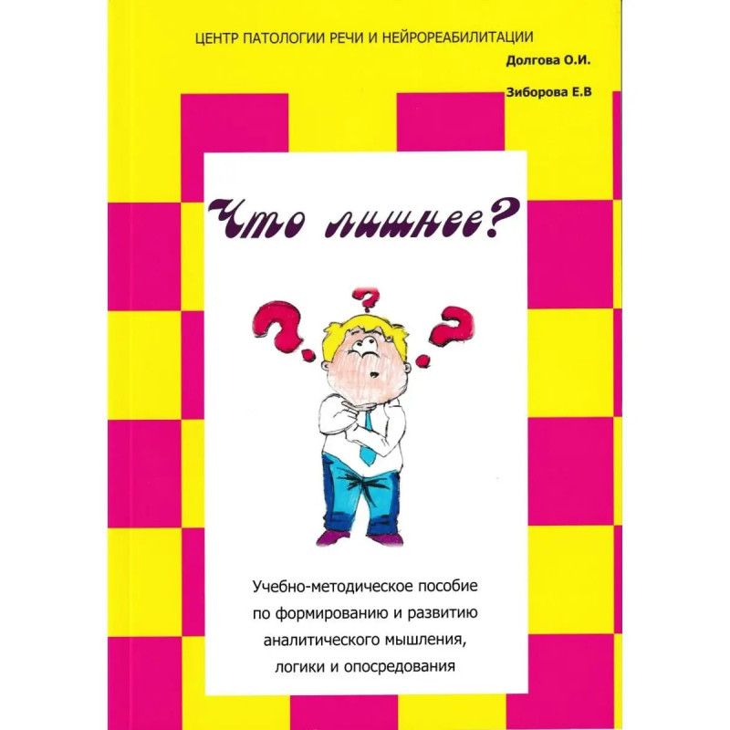 Что лишнее? Учебно-методическое пособие по формированию и развитию аналитического мышления. Данное пособие содержит более 300 цепочек логических заданий различного уровня сложности. Каждое задание даёт возможность развивать операции обобщения, категориальность, сравнительный анализ разной модальности. Все задания помогают формировать основную функцию, прежде всего, учебной деятельности - опосредование, которое предполагает перенесение навыков выполнения более простых заданий на более сложные. Материал в пособии построен по принципу от простого к сложному: от предметных, реалистичных рисунков к наглядно-образным, а затем к абстрактным, символическим изображениям. Данное учебно-методическое пособие может использоваться в работе с детьми, начиная с 3-4 лет, имеющих разную степень готовности и сформированности высших психических функций.
