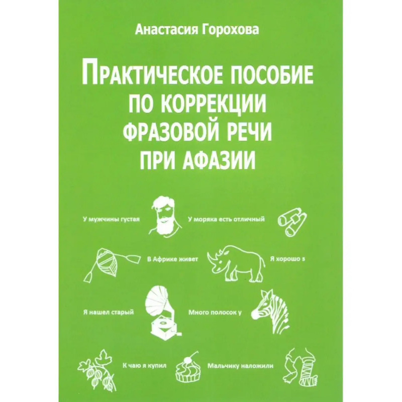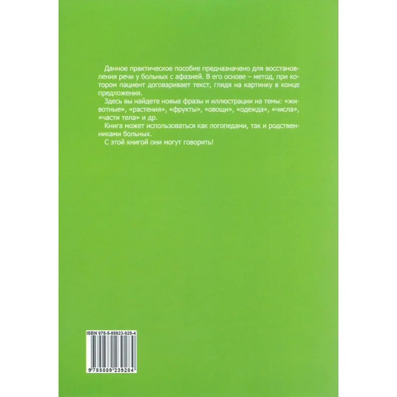 Практическое пособие по коррекции фразовой речи при афазии. Данное практическое пособие предназначено для восстановления речи у больных с афазией. В его основе - метод, при котором пациент договаривает текст, глядя на картинку в конце предложения.Здесь вы найдете новые фразы и иллюстрации на темы: "животные", "растения", "фрукты", "овощи", "одежда", "числа", "части тела" и др.Книга может использоваться как логопедами, так и родственниками больных. С этой книгой они могут говорить!