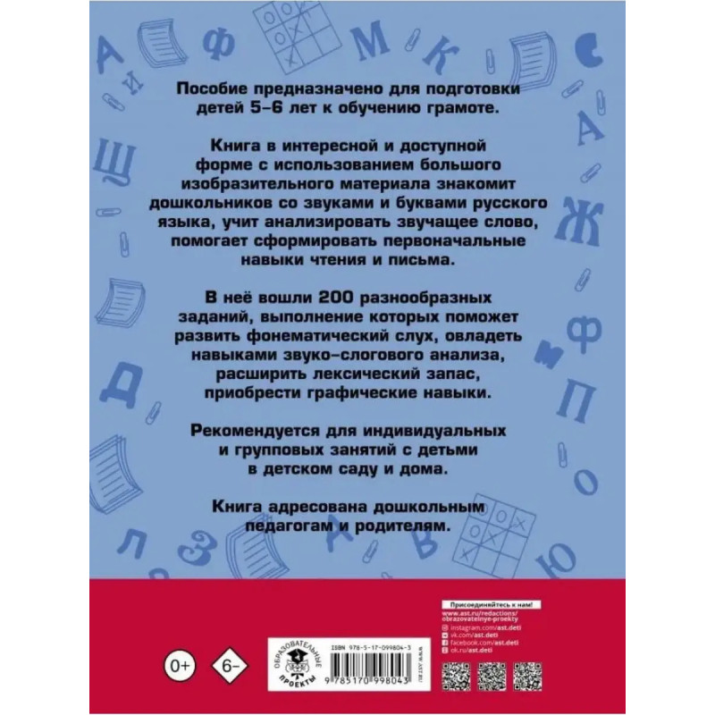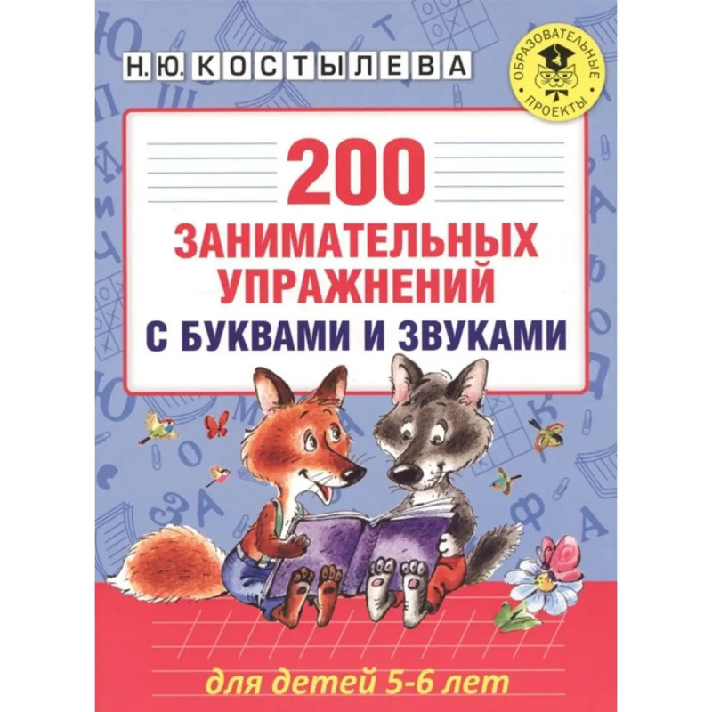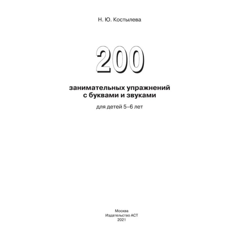 ISBN 9785-17099-8043. 200 занимательных упражнений с буквами и звуками для детей 5-6 лет. Костылева Н. Ю. Пособие предназначено для подготовки детей 5 - 6 лет к обучению грамоте.. В книгу вошли 200 разнообразных заданий, выполнение которых поможет развить фонематический слух, овладеть навыками звуко-слогового анализа, расширить лексический запас, приобрести графические навыки.. Издание адресовано дошкольным педагогам, логопедам и родителям.