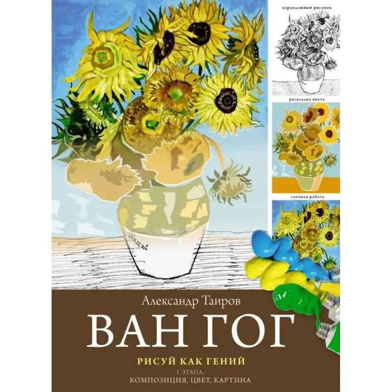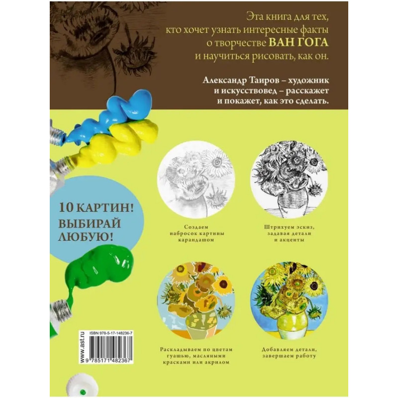 ISBN 9785-17148-2367. Ван Гог. Рисуй как гений. Таиров А. И. Эта книга для тех, кто не умеет рисовать, но хочет научиться, а также для тех, кто рисует неплохо, но готов совершенствоваться дальше. На примере десяти картин Ван Гога разных жанров, а среди них "Звездная ночь", "Кафе в Арле", "Автопортрет", "Подсолнухи", художник, известный искусствовед Александр Таиров поэтапно показывает, как работал мастер. Повторяя, вы сможете нарисовать картину, похожую на вангоговскую, добавив фантазии и глубже раскрыв свой собственный талант живописца. Лучше понять композицию и распределение цвета на полотне помогут раскраски, сделанные для каждой работы Ван Гога. Из книги вы также узнаете, какие Ван Гог использовал приемы, как выбирал цвета, почему столько внимания уделял свету и тени, каким видел и изображал мир и что в конечном итоге определило его столь узнаваемый всеми стиль.