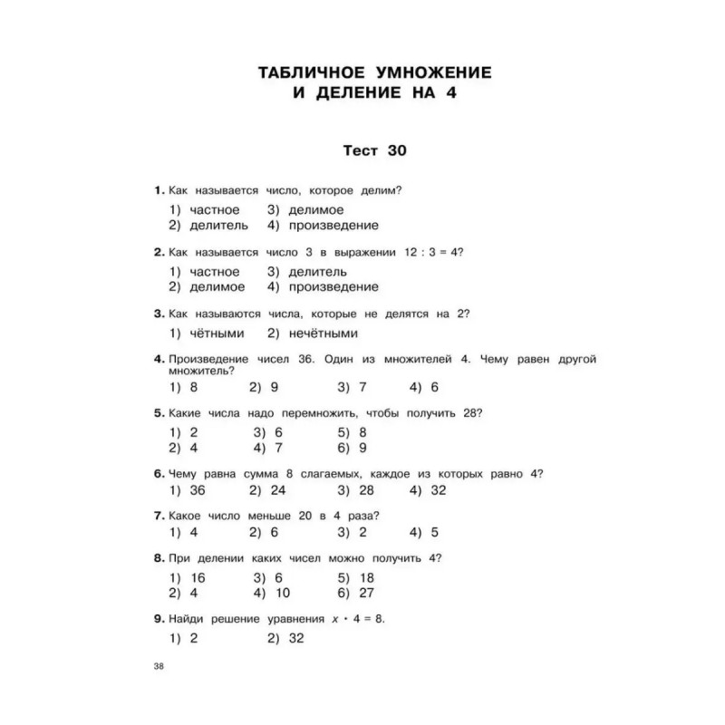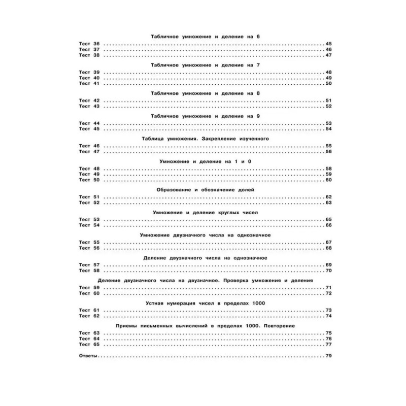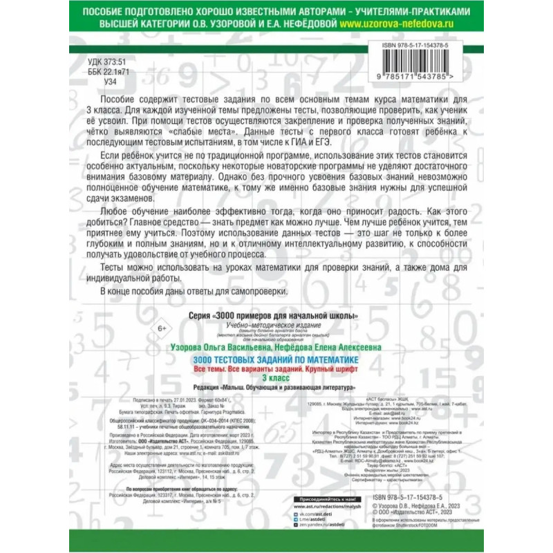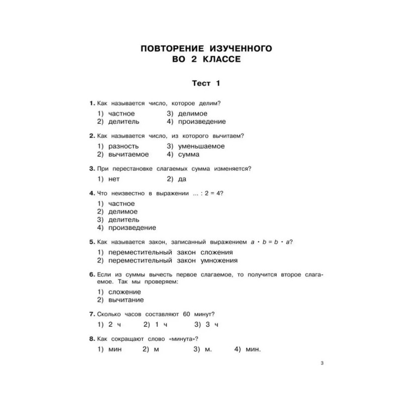 3000 тестовых заданий по математике. 3 класс. Крупный шрифт. Все темы и варианты. Узорова О. В., Нефедова Е. А. Пособие содержит тестовые задания по всем основным темам курса математики для 3 класса. Для каждой изученной темы предложены тесты, позволяющие проверить, как ученик её усвоил. При помощи тестов осуществляются закрепление и проверка полученных знаний, чётко выявляются слабые места. Данные тесты готовят ребёнка к последующим тестовым испытаниям, в том числе к ГИА и ЕГЭ. В конце книги для самопроверки даны ответы на тесты. Пособие можно использовать на уроках математики, а также для самостоятельных занятий дома.