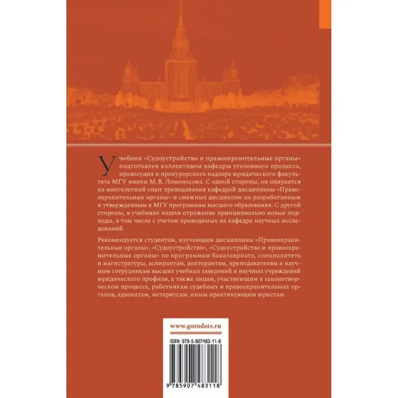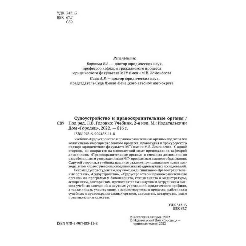 Судоустройство и правоохранительные органы. Головко Леонид Витальевич. Учебник "Судоустройство и правоохранительные органы" (второе издание) подготовлен коллективом кафедры уголовного процесса, правосудия и прокурорского надзора юридического факультета МГУ имени М.В.Ломоносова.С одной стороны, он опирается на многолетний опыт преподавания кафедрой дисциплины "Правоохранительные органы" и смежных дисциплин по разработанным и утвержденным в МГУ программам высшего образования. С другой стороны, в учебнике нашли отражение принципиально новые подходы, в том числе с учетом проводимых на кафедре научных исследований.Рекомендуется студентам, изучающим дисциплины "Правоохранительные органы", "Судоустройство", "Судоустройство и правоохранительные органы" по программам бакалавриата, специалитета и магистратуры, аспирантам, докторантам, преподавателям и научным сотрудникам высших учебных заведений и научных учреждений юридического профиля, а также лицам, участвующим в законотворческом процессе, работникам судебных и правоохранительных органов, адвокатам, нотариусам, иным практикующим юристам.