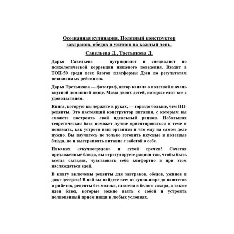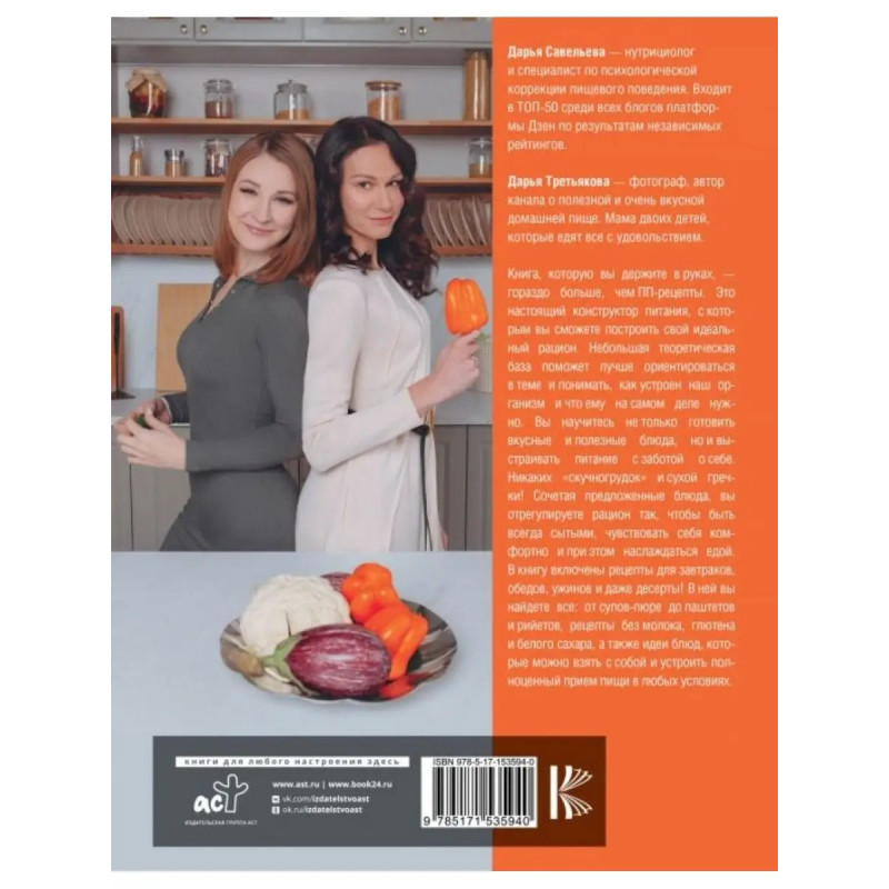 Осознанная кулинария. Полезный конструктор завтраков, обедов и ужинов на каждый день. Савельева Д., Третьякова Д. Дарья Савельева нутрициолог и специалист по психологической коррекции пищевого поведения. Входит в ТОП-50 среди всех блогов платформы Дзен по результатам независимых рейтингов. Дарья Третьякова фотограф, автор канала о полезной и очень вкусной домашней пище. Мама двоих детей, которые едят все с удовольствием. Книга, которую вы держите в руках, гораздо больше, чем ПП-рецепты. Это настоящий конструктор питания, с которым вы сможете построить свой идеальный рацион. Небольшая теоретическая база поможет лучше ориентироваться в теме и понимать, как устроен наш организм и что ему на самом деле нужно. Вы научитесь не только готовить вкусные и полезные блюда, но и выстраивать питание с заботой о себе. Никаких "скучногрудок" и сухой гречки! Сочетая предложенные блюда, вы отрегулируете рацион так, чтобы быть всегда сытыми, чувствовать себя комфортно и при этом наслаждаться едой. В книгу включены рецепты для завтраков, обедов, ужинов и даже десерты! В ней вы найдете все: от супов-пюре до паштетов и рийетов, рецепты без молока, глютена и белого сахара, а также идеи блюд, которые можно взять с собой и устроить полноценный прием пищи в любых условиях.