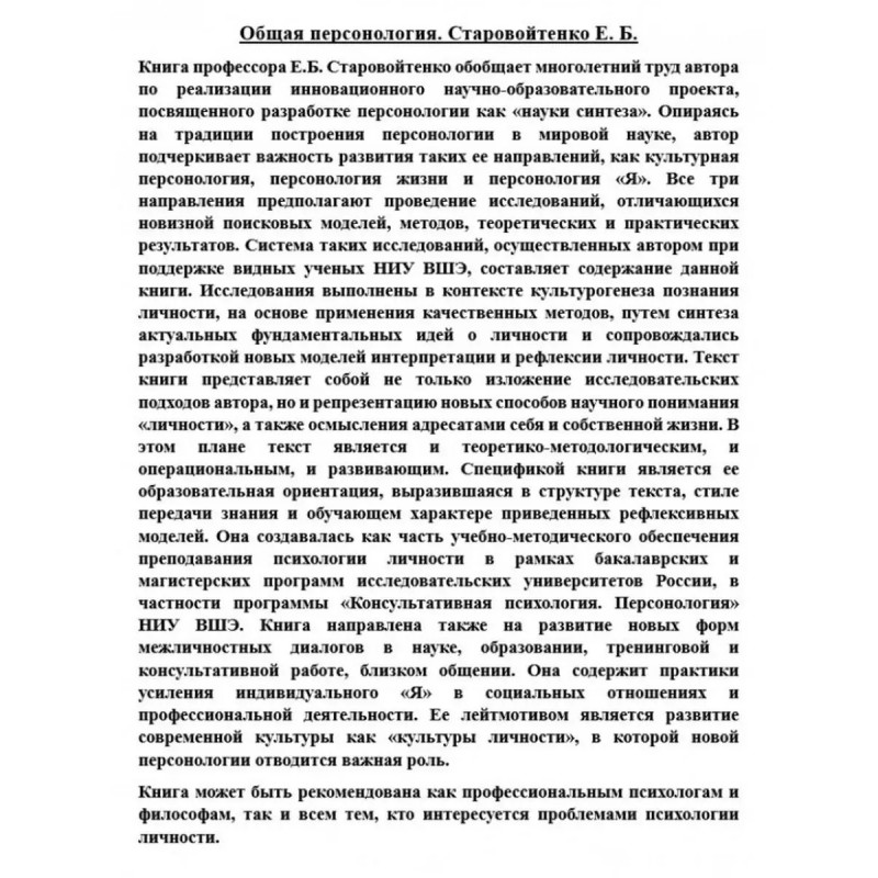 Общая персонология. Старовойтенко Е. Б. Книга профессора Е. Б. Старовойтенко обобщает многолетний труд автора по реализации инновационного научно-образовательного проекта, посвященного разработке персонологии как "науки синтеза". Опираясь на традиции построения персонологии в мировой науке, автор подчеркивает важность развития таких ее направлений, как культурная персонология, персонология жизни и персонология "Я". Все три направления предполагают проведение исследований, отличающихся новизной поисковых моделей, методов, теоретических и практических результатов. Система таких исследований, осуществленных автором при поддержке видных ученых НИУ ВШЭ, составляет содержание данной книги. Исследования выполнены в контексте культурогенеза познания личности, на основе применения качественных методов, путем синтеза актуальных фундаментальных идей о личности и сопровождались разработкой новых моделей интерпретации и рефлексии личности. Текст книги представляет собой не только изложение исследовательских подходов автора, но и репрезентацию новых способов научного понимания "личности", а также осмысления адресатами себя и собственной жизни. В этом плане текст является и теоретико-методологическим, и операциональным, и развивающим. Спецификой книги является ее образовательная ориентация, выразившаяся в структуре текста, стиле передачи знания и обучающем характере приведенных рефлексивных моделей. Она создавалась как часть учебно-методического обеспечения преподавания психологии личности в рамках бакалаврских и магистерских программ исследовательских университетов России, в частности программы "Консультативная психология. Персонология" НИУ ВШЭ. Книга направлена также на развитие новых форм межличностных диалогов в науке, образовании, тренинговой и консультативной работе, близком общении. Она содержит практики усиления индивидуального "Я" в социальных отношениях и профессиональной деятельности. Ее лейтмотивом является развитие современной культуры как "культуры личности", в...