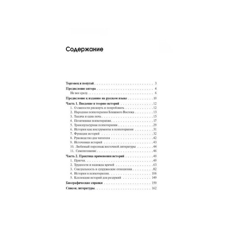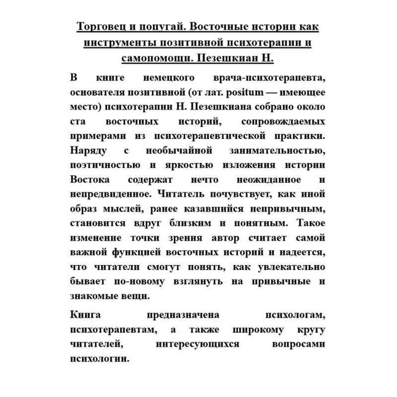Торговец и попугай. Восточные истории как инструменты позитивной психотерапии и самопомощи. Пезешкиан Н. В книге немецкого врача-психотерапевта, основателя позитивной (от лат. positum имеющее место) психотерапии Н. Пезешкиана собрано около ста восточных историй, сопровождаемых примерами из психотерапевтической практики. Наряду с необычайной занимательностью, поэтичностью и яркостью изложения истории Востока содержат нечто неожиданное и непредвиденное. Читатель почувствует, как иной образ мыслей, ранее казавшийся непривычным, становится вдруг близким и понятным. Такое изменение точки зрения автор считает самой важной функцией восточных историй и надеется, что читатели смогут понять, как увлекательно бывает по-новому взглянуть на привычные и знакомые вещи. Книга предназначена психологам, психотерапевтам, а также широкому кругу читателей, интересующихся вопросами психологии.