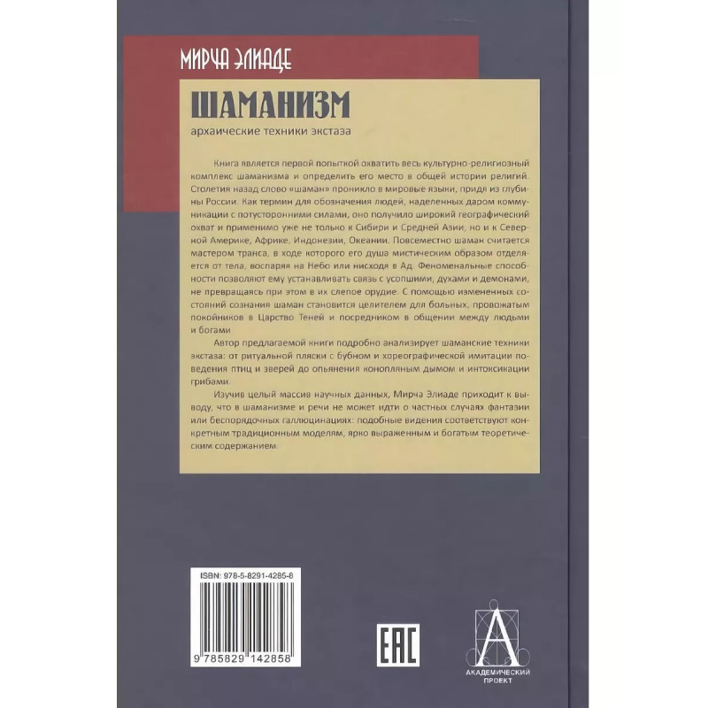 Шаманизм. Архаические техники экстаза. Элиаде Мирча. Книга является первой попыткой охватить весь культурно-религиозный комплекс шаманизма и определить его место в общей истории религий. Столетия назад слово "шаман" проникло в мировые языки, придя из глубины России. Как термин для обозначения людей, наделенных даром коммуникации с потусторонними силами, оно получило широкий географический охват и применимо уже не только к Сибири и Средней Азии, но и к Северной Америке, Африке, Индонезии, Океании. Повсеместно шаман считается мастером транса, в ходе которого его душа мистическим образом отделяется от тела, воспаряя на Небо или нисходя в Ад. Феноменальные способности позволяют ему устанавливать связь с усопшими, духами и демонами, не превращаясь при этом в их слепое орудие. С помощью измененных состояний сознания шаман становится целителем для больных, провожатым покойников в Царство Теней и посредником в общении между людьми и богами. Автор предлагаемой книги подробно анализирует шаманские техники экстаза: от ритуальной пляски с бубном и хореографической имитации поведения птиц и зверей до опьянения конопляным дымом и интоксикации грибами. Изучив целый массив научных данных, Мирча Элиаде приходит к выводу, что в шаманизме и речи не может идти о частных случаях фантазии или беспорядочных галлюцинациях: подобные видения соответствуют конкретным традиционным моделям, ярко выраженным и богатым теоретическим содержанием. Издание адресовано студентам и преподавателям гуманитарных специальностей вузов, а также читателям, интересующимся антропологической и религиоведческой тематикой.