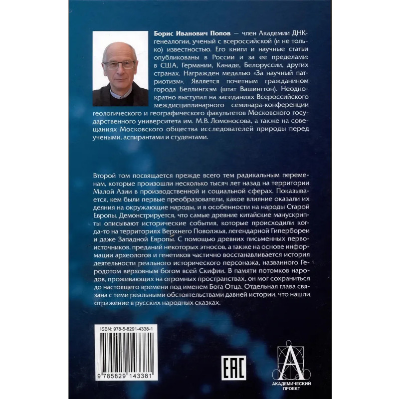 Второй том посвящается прежде всего тем радикальным переменам, которые произошли несколько тысяч лет назад на территории Малой Азии в производственной и социальной сферах. Показывается, кем были первые преобразователи, какое влияние оказали их деяния на окружающие народы, и в особенности на народы Старой Европы. Демонстрируется, что самые древние китайские манускрипты описывают исторические события, которые происходили когда-то на территориях Верхнего Поволжья, легендарной Гипербореи и даже Западной Европы. С помощью древних письменных первоисточников, преданий некоторых этносов, а также на основе информации археологов и генетиков частично восстанавливается история деятельности реального исторического персонажа, названного Геродотом верховным богом всей Скифии. В памяти потомков народов, проживающих на огромных пространствах, он мог сохраниться до настоящего времени под именем Бога Отца. Отдельная глава связана с теми реальными обстоятельствами давней истории, что нашли отражение в русских народных сказках. Книга может быть интересна как историкам, так и кругу заинтересованных читателей