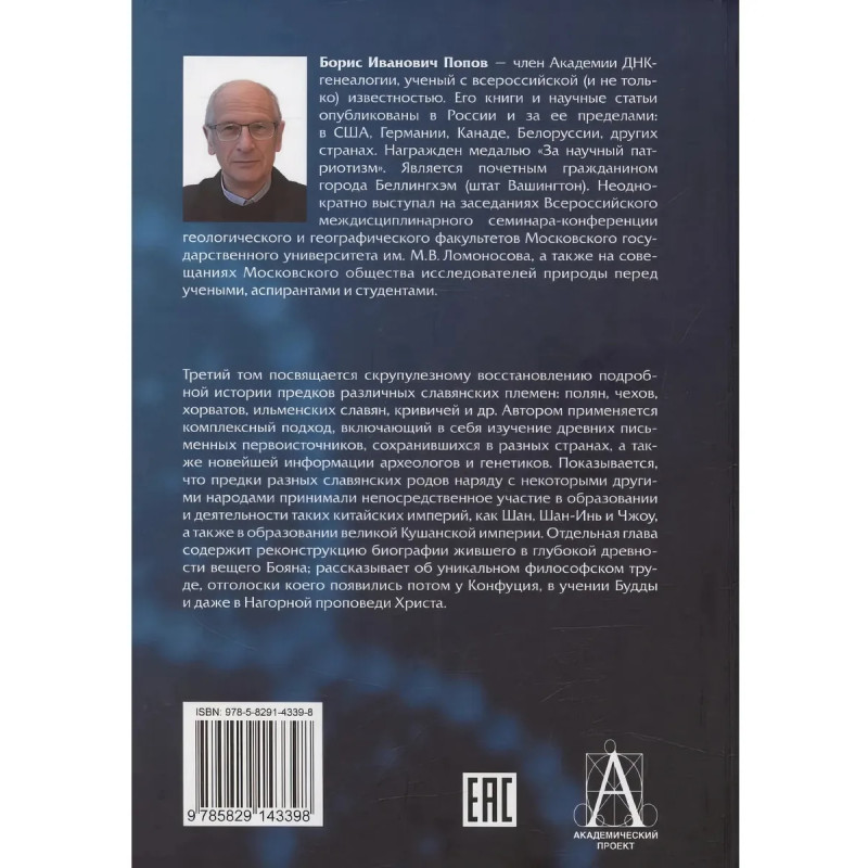Третий том посвящается скрупулезному восстановлению подробной истории предков различных славянских племен: полян, чехов, хорватов, ильменских славян. кривичей и др. Автором применяется комплексный подход, включающий в себя изучение древних письменных первоисточников, сохранившихся в разных странах, а также новейшей информации археологов и генетиков. Показывается, что предки разных славянских родов наряду с некоторыми другими народами принимали непосредственное участие в образовании и деятельности таких китайских империй, как Шан. Шан-Инь и Чжоу, а также в образовании великой Кушанской империи. Отдельная глава содержит реконструкцию биографии жившею в глубокой древности вещего Бояна; рассказывает об уникальном философском труде, ополоски коего появились потом у Конфуция, в учении Будды и даже в Нагорной проповеди Христа. Книга может быть интересна как историкам, так и кругу заинтересованных читателей.