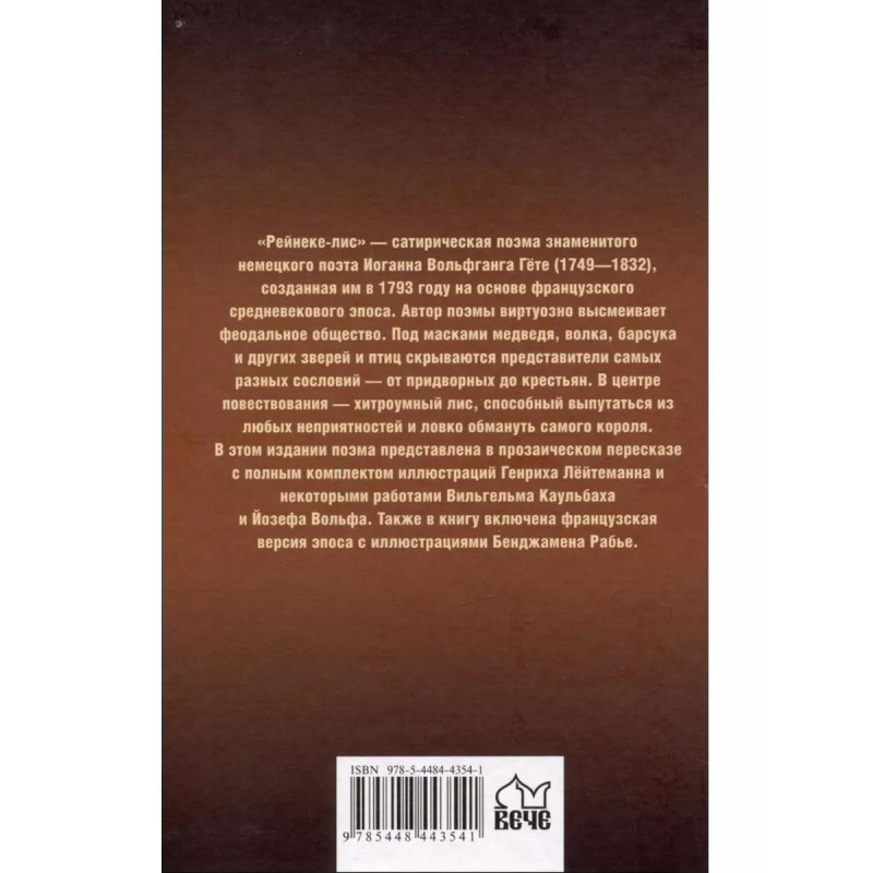Рейнеке - лис. Гёте И. В. ""Рейнеке-лис" сатирическая поэма знаменитого немецкого поэта Иоганна Вольфганга Гёте (1749 1832), созданная им в 1793 году на основе французского средневекового эпоса. Автор поэмы виртуозно высмеивает феодальное общество. Под масками медведя, волка, барсука и других зверей и птиц скрываются представители самых разных сословий от придворных до крестьян. В центре повествования хитроумный лис, способный выпутаться из любых неприятностей и ловко обмануть самого короля. В этом издании поэма представлена в прозаическом пересказе с полным комплектом иллюстраций Генриха Лейтеманна и некоторыми работами Вильгельма Каульбаха и Йозефа Вольфа. Также в книгу включена французская версия эпоса с иллюстрациями Бенджамена Рабье. "