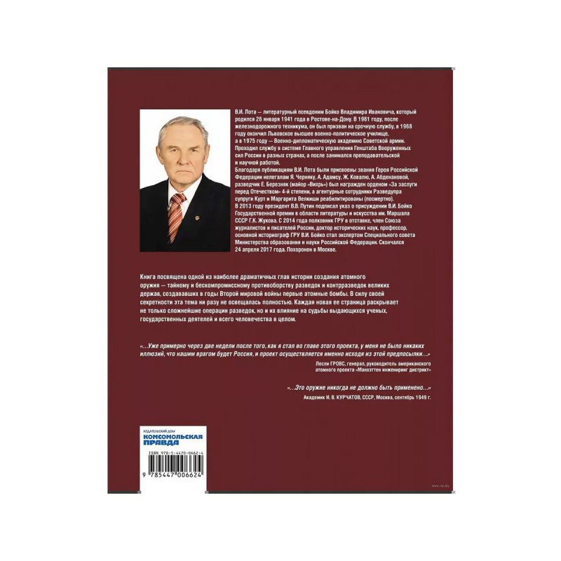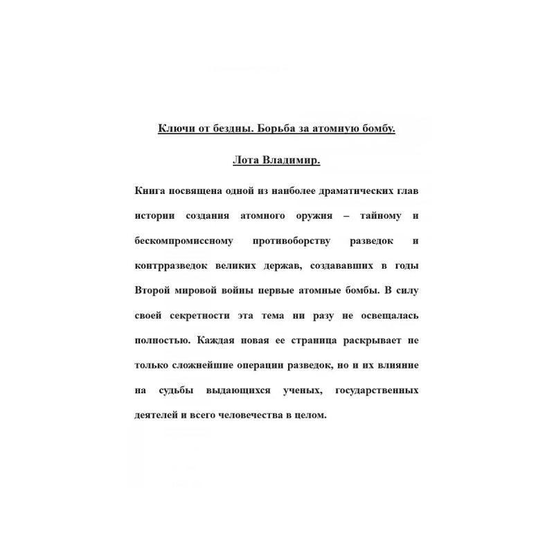 Ключи от бездны. Борьба за атомную бомбу. Лота Владимир. Книга посвящена одной из наиболее драматических глав истории создания атомного оружия тайному и бескомпромиссному противоборству разведок и контрразведок великих держав, создававших в годы Второй мировой войны первые атомные бомбы. В силу своей секретности эта тема ни разу не освещалась полностью. Каждая новая ее страница раскрывает не только сложнейшие операции разведок, но и их влияние на судьбы выдающихся ученых, государственных деятелей и всего человечества в целом.