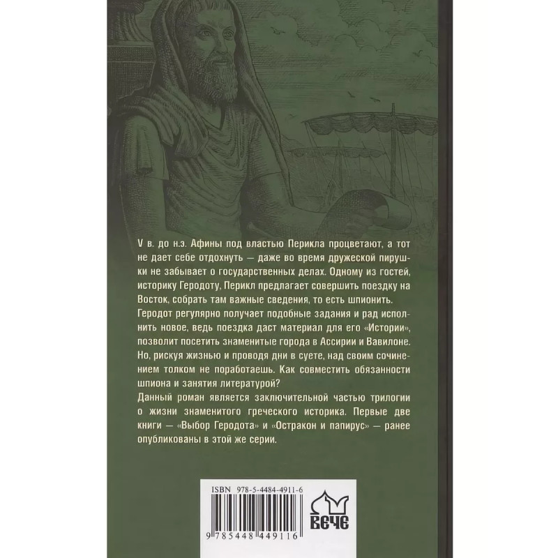 Города богов. Суханов С. С. V в. до н. э. Афины под властью Перикла процветают, а тот не дает себе отдохнуть даже во время дружеской пирушки не забывает о государственных делах. Одному из гостей, историку Геродоту, Перикл предлагает совершить поездку на Восток, собрать там важные сведения, то есть шпионить. Геродот регулярно получает подобные задания и рад исполнить новое, ведь поездка даст материал для его Истории, позволит посетить знаменитые города в Ассирии и Вавилоне. Но рискуя жизнью и проводя дни в суете, над своим сочинением толком не поработаешь. Как совместить обязанности шпиона и занятия литературой?Данный роман является заключительной частью трилогии о жизни знаменитого греческого историка. Первые две книги Выбор Геродота и Остракон и папирус ранее опубликованы в этой же серии.