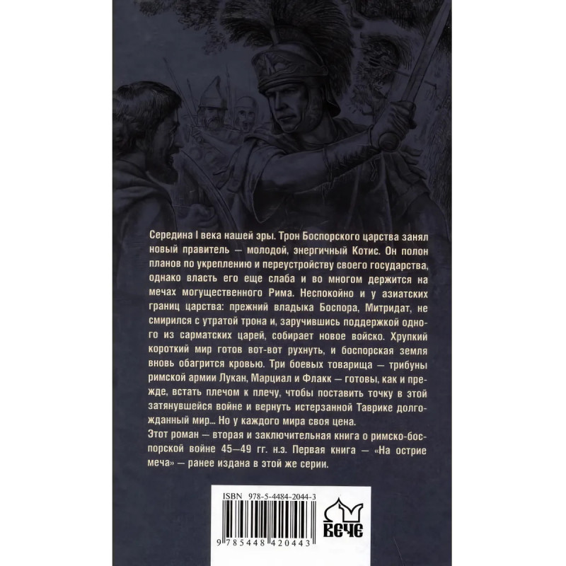 Середина I века нашей эры. Трон Боспорского царства занял новый правитель молодой, энергичный Котис. Он полон планов по укреплению и переустройству своего государства, однако власть его еще слаба и во многом держится на мечах могущественного Рима. Неспокойно и у азиатских границ царства: прежний владыка Боспора, Митридат, не смирился с утратой трона и, заручившись поддержкой одного из сарматских царей, собирает новое войско. Хрупкий короткий мир готов вот-вот рухнуть, и боспорская земля вновь обагрится кровью. Три боевых товарища трибуны римской армии Лукан, Марциал и Флакк готовы, как и прежде, встать плечом к плечу, чтобы поставить точку в этой затянувшейся войне и вернуть истерзанной Таврике долгожданный мир... Но у каждого мира своя цена. Этот роман вторая и заключительная книга о римско-боспорской войне 4549 гг. н. э. Первая книга "На острие меча" ранее издана в этой же серии.