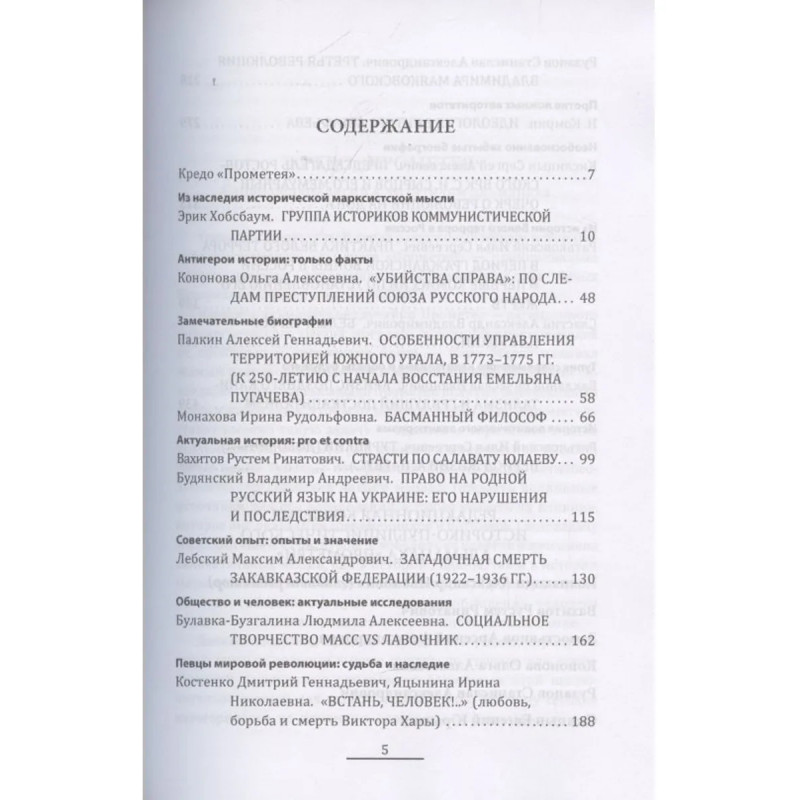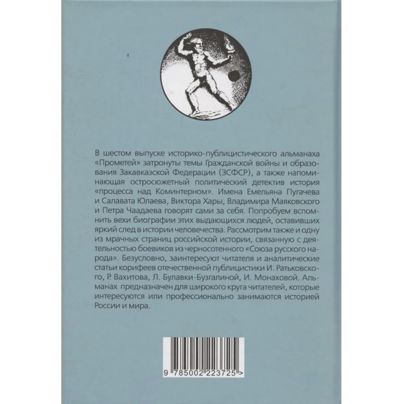В шестом выпуске историко-публицистического альманаха «Прометей», затронуты темы Гражданской войны и образования Закавказской Федерации (ЗСФСР), а также напоминающая остросюжетный политический детектив история «процесса над Коминтерном». Имена Емельяна Пугачева и Салавата Юлаева, Виктора Хары, Владимира Маяковского и Петра Чаадаева говорят сами за себя. Попробуем вспомнить вехи биографии этих выдающихся людей, оставивших яркий след в истории человечества. Рассмотрим также и одну из мрачных страниц российской истории, связанную с деятельностью боевиков из черносотенного «Союза русского народа». Безусловно, заинтересуют читателя и аналитические статьи корифеев отечественной публицистики И. Ратьковского, Р. Вахитова, Л. Булавки-Бузгалиной, И. Монаховой. Альманах предназначен для широкого круга читателей, которые интересуются или профессионально занимаются историей России и мира.