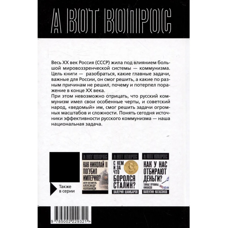 Весь ХХ век Россия (СССР) жила под влиянием большой мировоззренческой системы – коммунизма. Цель книги разобраться, какие главные задачи, важные для России, он смог решить, а какие по разным причинам не решил, почему и потерпел поражение в конце ХХ века. При этом невозможно отрицать, что русский коммунизм имел свои особенные черты, и советский народ, «ведомый» им, смог решить задачи огромных масштабов и сложности. Понять сегодня источники эффективности русского коммунизма – наша национальная задача.