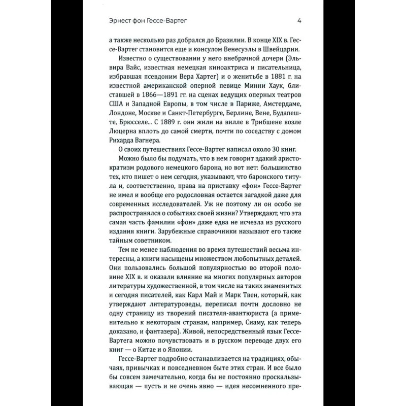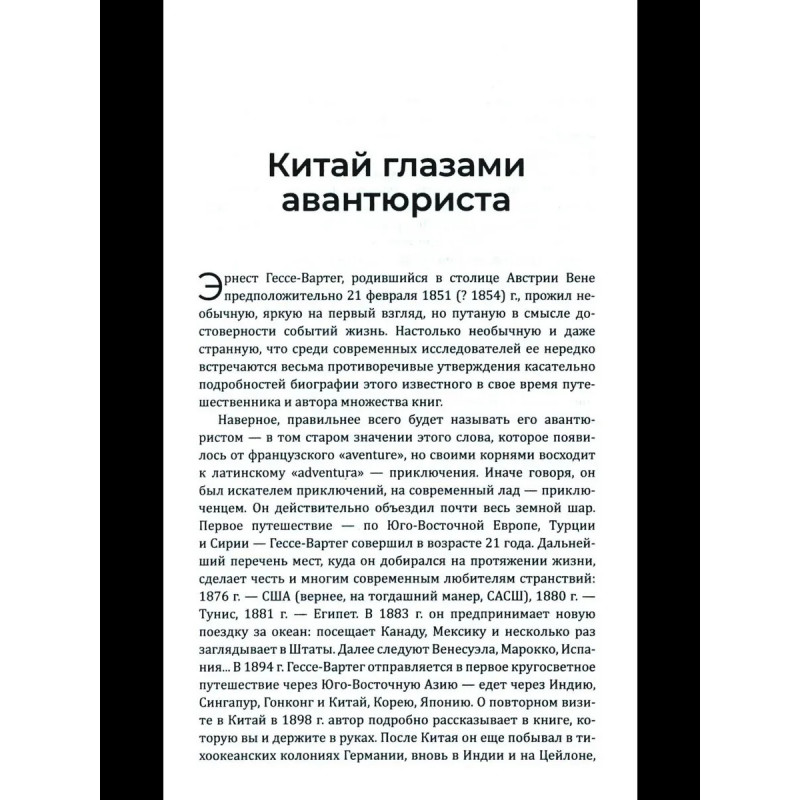 Гессе-Вартег фон Э. Китай и китайцы. Жизнь, нравы, обычаи Эрнест Гессе-Вартег путешественник, дипломат, автор популярнейших во второй половине XIX в. книг, повлиявших на знаменитых Карла Мая и Марка Твена; фантазёр и авантюрист с таинственной биографией... Его книги интересны и познавательны по сей день. В них мы можем увидеть, например, Китай, таким, какого уже нет сегодня, но при этом очень знакомым нам по множеству популярных фильмов. Откройте для себя Китай эпохи династии Цинь страну, стоявшую на пороге коренных перемен, одну из древнейших цивилизаций нашей планеты, взгляните на неё глазами европейского путешественника, и вы точно не будете разочарованы.