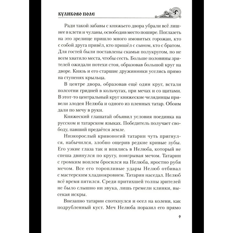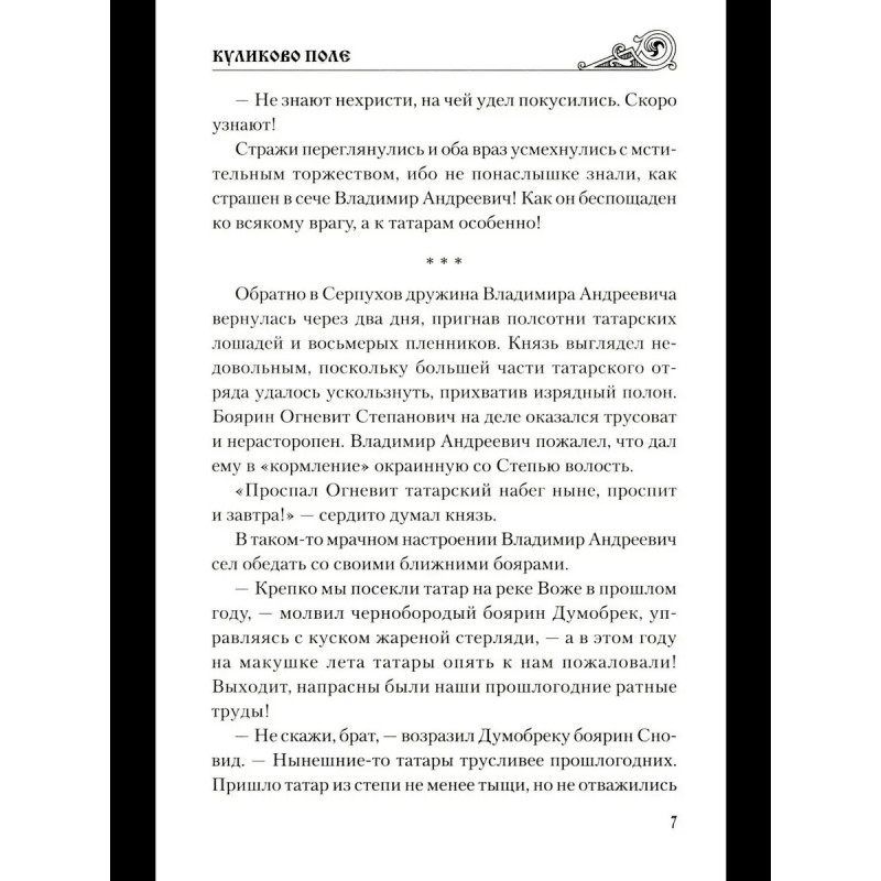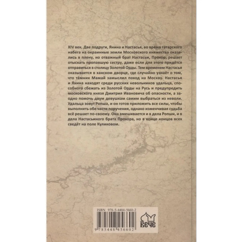 Поротников В. П. Куликово поле: романXIV век. Две подруги, Янина и Настасья, во время татарского набега на окраинные земли Московского княжества оказались в плену, но отважный брат Настасьи, Прохор, решает отыскать пропавшую сестру, даже если для этого придётся отправиться в столицу Золотой Орды. Тем временем Настасья оказывается в ханском дворце, где случайно узнаёт о том, что тёмник Мамай замыслил поход на Москву. Настасья и Янина находят среди русских невольников удальца, способного сбежать из Золотой Орды на Русь и предупредить московского князя Дмитрия Ивановича об опасности, а заодно помочь двум девушкам самим выбраться из неволи. Удальца зовут Ропша, и он готов приложить все силы, чтобы выполнить обе части поручения, однако изменчивая судьба всё решает по-своему. Она вмешивается и в дела Ропши, и в дела Настасьиного брата Прохора, но в конце концов всех сведет на поле Куликовом.